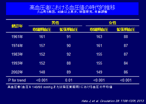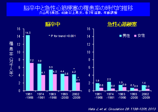 半世紀以上にわたる長い研究期間中に日本人の生活習慣は大きく変化し、それに伴い心血管病やその危険因子の実態も大きく様変わりした。そこで、時代の異なる5集団(1961年、1974年、1983年、1993年、2002年)の健診成績を用いて、心血管病の主な危険因子の有病率の時代的推移を検討した。その結果、高血圧の有病率に大きな時代的変化はないものの、降圧療法の普及に伴い高血圧者の血圧レベルは時代とともに有意に低下した。一方、肥満、高コレステロール血症、糖代謝異常といった代謝性疾患の頻度は時代とともに増加した。この5集団をそれぞれ7年間追跡した成績によると、脳卒中罹患率は主に1960年代から1970年代にかけて大きく低下し、高血圧管理の改善によるものと考えられる。しかし、代謝性疾患の有病率が増加した結果、脳卒中罹患率の低下の程度は1980年代以降鈍化し、また急性心筋梗塞の罹患率には過去半世紀にわたって明らかな変化がなかった。