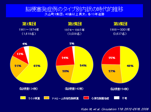 脳卒中のうち脳梗塞はさらにラクナ梗塞、アテローム血栓性脳梗塞、心原性脳塞栓症などに分類される。そこで、3集団(1961年、1974年、1988年)をそれぞれ13年間追跡した成績を用いて、脳梗塞のタイプ別内訳を検討した。第1集団(1961〜1974年)ではラクナ梗塞は全脳梗塞の6〜7割を占めていたが、時代とともにその割合は低下した。一方、アテローム血栓性脳梗塞、心原性脳塞栓症の占める割合は時代とともに増加し、日本人の脳梗塞タイプが時代とともに欧米化していると考えられる。