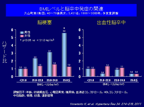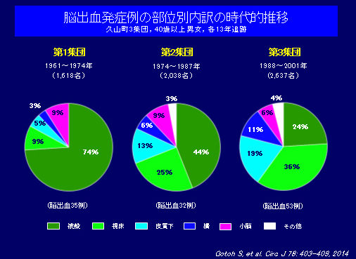 また、同じ集団を用いて脳出血の部位別内訳を検討した。第1集団では被殻出血が全脳出血の約4分の3を占めていたが、時代とともにその割合は低下した。一方、視床出血の占める割合が時代とともに増加した。降圧療法の普及により比較的若い世代(60歳代)の被殻出血罹患率が減少したが、人口の高齢化に加えて高齢者における血圧管理が不十分であることにより高齢者(80歳以上)の視床出血罹患率が増加している。 今後、日本人の心血管病を予防するためには急増する代謝性疾患の対策に加えて、高齢者における血圧管理が課題であるといえる。