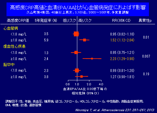 近年、血液や尿など体液中の微量物質を測定することにより生体内の変化を捉えるいくつかのバイオマーカーが開発され、その臨床的意義が確立されるとともに日常診療や疫学研究に応用されている。久山町研究では、これまでに慢性炎症の指標である高感度C反応性タンパク(CRP)や心不全のマーカーである脳性ナトリウム利尿ペプチド前駆体N端フラグメント(NT-proBNP)の血中濃度が心血管病の発症リスクと正の関連を示すこと、代表的な必須脂肪酸であるエイコサペンタエン酸(EPA)とアラキドン酸(AA)の血中濃度比は高感度CRP高値群において心血管病の発症リスクと負の関連を示すことを報告した。